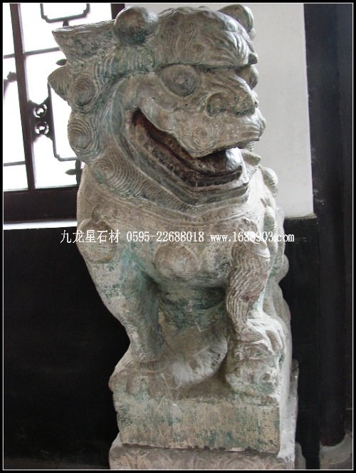 子是莊園青石雕刻的又一大類別。眾多的門墩石獅,經清代民間藝術家的大膽想象、沿承、夸張,這一藝術品成了宅第建筑中不可替代的裝飾像,無論體量大小,均威武、高貴而又憨態(tài)可掬。為增強裝飾效果,莊園的獅子形象大多頭大臉闊,額隆頰豐,箕口肉鼻,前額突出,從禿頂式的頭部到項背披有漩式鬣毛。胸飾纓絡華飾,脖上掛有鈴鐺,形態(tài)俯首縮足。雌獅掌撫幼獅,有的還背負其子;雄獅腳踏繡球或嘴銜彩帶,背負繡球,較多地汲取了民間傳統(tǒng)舞獅藝術的成分,富有較強的鄉(xiāng)土氣息和喜慶風格。