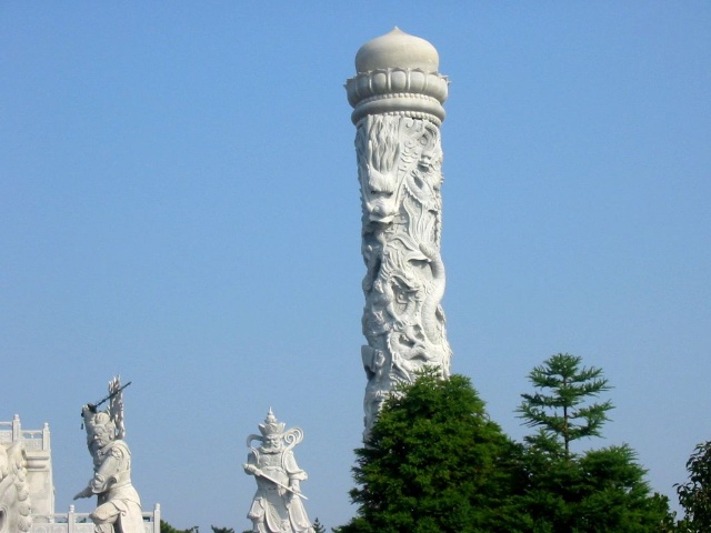 禮佛廣場(chǎng)上四大天王塑成了中國(guó)古代的武將形象,這是古印度佛教傳入中國(guó)后,佛教文化和中華文化相圓融的結(jié)果。 “這四大天王塑像的原形,他們的出身并不是很高貴,而是屬于那種“放下屠刀,立地成佛”的人物。四大天王原形的由來(lái),源于古典小說(shuō)“封神演義”中“魔家四將”。在周武王率兵起義,反對(duì)暴虐的無(wú)道君主——商紂王的正義戰(zhàn)爭(zhēng)中,這魔家四兄弟曾經(jīng)率兵于佳夢(mèng)關(guān)一線阻擋周武王東進(jìn)的軍隊(duì)。經(jīng)過(guò)數(shù)番爭(zhēng)斗,結(jié)果是被周武王的軍隊(duì)盡數(shù)殲滅,魔里海、魔里青、魔里壽、魔里紅這四兄弟也亡命于周軍之手。戰(zhàn)爭(zhēng)結(jié)束后,這四個(gè)助桀為虐的“魔頭”,經(jīng)姜子牙開(kāi)封神榜時(shí),就被任命為“四大天王”。