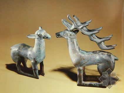 春秋以后的青銅器以人形為支架的逐漸多了起來,重要的代表作品有湖北隨縣曾侯乙墓所出的一組鐘架銅人,還出土蟠龍建鼓座。在河南洛陽金村的東周墓葬中出土有銅、銀、玉等不同材質(zhì)的人物形象。還有江蘇漣水三里墩所出的銅臥鹿。這些都是戰(zhàn)國時(shí)期的作品。