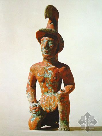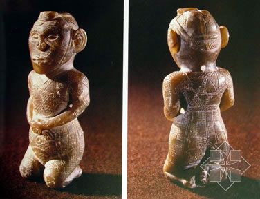 1979年在遼寧咯左旗大城子鎮(zhèn)東山嘴紅山文化(距今5,000多年 )遺址,發(fā)現(xiàn)了兩件小型孕婦像和20多件人像殘塊(左腿疊于右腿盤膝正坐,雙手交叉于腹部)。這里是進(jìn)行祭祀活動的場所,方形基址是祭奉地母神的祭壇,而圓臺可能是供奉生育神或農(nóng)神的祭壇。女像的頭部、右臂及膝下已殘缺,體形肥碩的一件表面磨光,著紅彩。