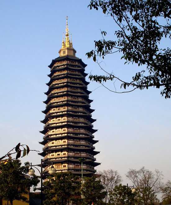天寧寶塔乃中華第一佛塔(全球最高佛塔)位于江蘇省常州市天寧寺內。天寧寶塔始建于2002年4月,于2007年4月30日開光。總建面積2.7萬平方米,塔高13層153.79米,為國內4000多座寶塔之最;從底層地宮到頂層鐘樓,整座寶塔以佛教文化為主線,以東陽木雕、揚州漆器、常州亂針繡、惠安石雕等手工藝術為表現(xiàn)手法,巧妙地詮釋了大乘佛教的諸多教義。佛塔的建成,與北方云崗大佛、中原龍門大佛、西方樂山大佛、東方靈山大佛、南方香港天壇大佛遙相呼應,成為五方五佛的佛心。