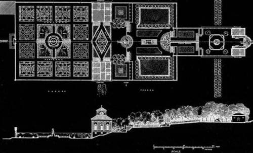 莊園四層臺地的布局均由一條中央軸線連接而成。中央軸線為一流水線,而各臺地再此軸線上都設有水景。花壇、建筑、臺階等均對稱布置在軸線兩側。在園路布置方面也順應軸線兩側布置,再以橫向園路連接。整個園雖由圍墻封閉,但在橫向縱向均設有多個門口方便出入。由于莊園設在臺地上,所以臺階的布置尤為重要。臺階不僅僅是用于連接每層臺地,另一重要的作用是引導游人走向園中最美的景色中。所以每一層的臺階布置都有所不同。如連接二、三層的臺階并沒有設為縱向連接,而是設為橫向上坡,其目的是讓客人的目光轉向美麗的水景。而連接三四層的臺階也是為了將客人引向水階梯。