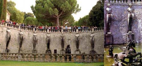 噴泉:蒙塔爾托主教入主別墅時期,他按照當年維尼奧拉的整體設計,繼續(xù)建造花園的中央噴泉--意大利風格主義雕塑家詹博洛尼亞(1529-1608)設計建造的"摩爾噴泉":4個石欄圍繞的水池,石欄上矗立著石雕花瓶,4個水池中央便是一組高聳的年輕運動員的輝煌雕塑,他們高高舉起象征著蒙塔爾托主教家族姓氏的"阿爾托山"。從遠處看去,這些有力的塑像十分宏大,黑黝黝地閃耀,以至于人們會認為它們是青銅,可是難以置信的是,它們是最好的、最堅硬的石灰華在陽光與水的作用下生成的一種堅硬如鐵的物質。后來意大利新古典主義雕塑大師卡諾瓦來到這里時,大為驚訝,他一邊拿起錘子輕輕敲打著它,一邊發(fā)出如此的感嘆:"它將比大理石更長久"。