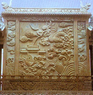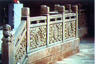 莊園大量的石雕,還是砂石作品。其石材多取于附近山中,質(zhì)地有白、綠、紅、青多種,主要用于橋、廳、臺、廊的護欄和柱體,半亭花墻、影壁和牌坊,刀法較青石作品粗獷、雄渾,畫面疏朗典雅、疏密得當(dāng)、虛實和諧、古樸堅實,顯得特別有氣魄。杏壇、街心牌坊、祠堂獻廳圍欄、養(yǎng)和堂階欄、半亭、三星影壁和莊園西門魚躍龍門巨幅石額,就是砂石雕刻的代表作。
