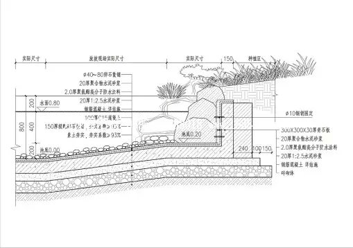 2.對于小型人工湖和造價許可時可以采用鋼筋混凝土硬質(zhì)湖底和駁岸。湖底具體做法可查閱文科相關(guān)項目設(shè)計圖紙。