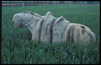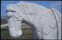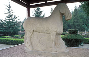 古代陵園石雕遺存實(shí)物最早的是引人注目的西漢霍去病墓石雕,作品原在陜西省興平縣漢武帝茂陵?yáng)|面霍去病墓上與墓前?,F(xiàn)已發(fā)現(xiàn)的石雕作品有造型各異、天趣宛然的動(dòng)物、人物等共十四件。霍去病為西漢名將,漢武帝為表彰其功、紀(jì)念其人,于茂陵?yáng)|面選定其墓址并“為冢象祁連山”,據(jù)《史記?衛(wèi)將軍驃騎傳?索隱》記:其墓“冢上有豎石,前有石馬相對(duì),又有石人”。今存作品即記載中的部分原物。它們可以分為兩類,一是通常被稱之為“馬踏匈奴”的立馬,二是其它渚石。立馬的原在位置是墓前不遠(yuǎn),長(zhǎng)年來(lái)未有大的移動(dòng),從形式上看為靜立姿態(tài),尺度適中,符合一般早期墓前石雕的制作規(guī)律,相信此即記載中相對(duì)而立的石馬,只是另一件已無(wú)存,“石人”也不見了。唐薛逢《漢武帝祠》詩(shī)云:“茂陵煙雨埋弓箭,石馬無(wú)聲蔓草寒”。詩(shī)中所指茂陵石馬當(dāng)系帝陵制度,但與霍墓立馬的位置及造型表現(xiàn)肯定有直接關(guān)系。西漢時(shí)期陵園墓前設(shè)置石雕已成風(fēng)氣,關(guān)于石人石獸的記載與遺存并不罕見,因此霍去病墓前石馬并非例外,實(shí)屬常規(guī)設(shè)置,它為我們提供了代所完善的石象生設(shè)置與造型形式之源的現(xiàn)知最早實(shí)物證據(jù)。