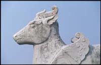 漢代墓葬手段逐漸完善之時(shí),神靈的偶像也大規(guī)模出現(xiàn),它們體現(xiàn)著人們對(duì)神的認(rèn)識(shí)、崇拜和依賴,它被認(rèn)為會(huì)給陵墓帶來(lái)吉祥,給墓主靈魂以庇護(hù)和幫助,會(huì)驅(qū)逐鬼怪邪祟。魏晉南北朝時(shí)期這種偶像化更為明顯,為后代確定了神靈崇拜的偶像模式。陵園神道兩側(cè)列置著石雕天祿辟邪;墓室里陳放著陶塑的鎮(zhèn)墓獸;壁畫描繪著羽人、飛天、神靈;墓門棺槨上也刻劃著方相氏的形象。前代的這種審美表現(xiàn)因素影響著唐陵石雕藝術(shù)表現(xiàn)的一個(gè)重要方面,即歸結(jié)出天馬、天鹿等神靈崇拜的占有一定比例的造型表現(xiàn)部分。末陵石雕的角端、瑞禽明清陵園石雕的麒麟、獬豸等都是這種基礎(chǔ)內(nèi)容模式的演變。先民們?cè)噲D通過陵墓這一特殊的環(huán)境達(dá)到人與神的有效溝通,在這個(gè)意義上造型手段起著關(guān)鍵性作用。陵墓被視為人神共處的理想化的虛幻而可信的環(huán)境,在這里天國(guó)、人間、地獄融為一體,形成完整的世界。可以說(shuō),對(duì)神靈的崇拜心理和原始宗教的世界觀是決定墓葬表現(xiàn)形式的重要因素。