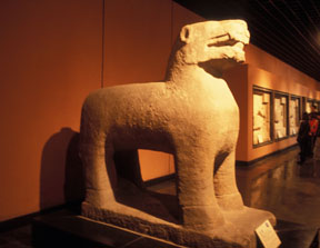 藏王墓位于西藏自治區(qū)瓊結(jié)縣,是公元七——九世紀(jì)歷代吐蕃贊普的墓葬群,現(xiàn)存石獅一對(duì)和石碑、柱等。造型除受中原影響外,樣式特征亦帶有波斯風(fēng)格影響。