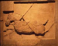 “昭陵六駿”,與其說(shuō)是表現(xiàn)雕刻的美不如說(shuō)是表現(xiàn)繪畫的美。據(jù)記載,昭陵是在杰出美術(shù)家閻立德主持下修建的,并由其弟閻立本圖繪十四國(guó)君長(zhǎng)像為石刻范本?,F(xiàn)存十四國(guó)君長(zhǎng)像頭部殘塊顯示的確有寫真特征,面部皺紋用線刻形式加以表現(xiàn),甚至眼角的紋路亦不放過,形象追求“寫真性”,突出個(gè)人的容顏特點(diǎn),在某種程度上帶有一定的摹刻繪畫性,不同于一般的石人?!傲E”所表現(xiàn)的是唐太宗征戰(zhàn)慣用的六匹戰(zhàn)功馬,宋游師雄題《六駿碑》中記述了石刻當(dāng)時(shí)安置的次序:颯露紫(西第一)、特勒(勤)驃(東第一)、拳毛馬咼 (西第二)、青騅(東第二)、白蹄烏(西第三)、什伐赤(東第三)?!傲E”表現(xiàn)為類似于漢畫象石刻中浮雕的形式,在方形外框中刻畫馬的側(cè)面形象,韻致非常接近于唐代繪畫中馬的表現(xiàn)。“六駿”是具體指象,即“刻石為常所乘破敵馬六匹”(《唐會(huì)要?卷二十》),有形象的特定要求,而且選擇了戰(zhàn)馬中箭、奔馳、療傷的情節(jié)并刻畫出了馬頸部的“三花紋”這類細(xì)節(jié)。這都宜于繪畫表現(xiàn)而不宜于圓雕表現(xiàn)。既然人像石雕可以繪畫為范本,馬的石雕當(dāng)然也完全可能以繪畫為范本。昭陵沒有效法圓雕形式表現(xiàn)鞍馬,原因之一就在于類似畫象石的浮雕形式更便于傳達(dá)繪畫性表現(xiàn)內(nèi)容,避免圓雕所受的材料限制,從而傳達(dá)“六駿”特有的紀(jì)實(shí)性審美意味。
