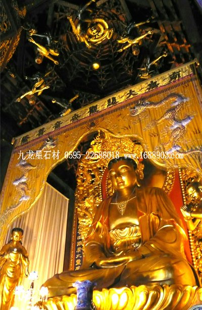 九龍殿:可以說是普陀山上龍文化的集大成之杰作。此殿在清康熙三十八年建成后,世稱“宏制巧構(gòu),甲于東南”,名聞天下。據(jù)史料記載,清康熙四年,普陀山曾遭荷蘭殖民主義者侵占和掠奪,法雨寺殿宇被毀。三十八年經(jīng)康熙恩準(zhǔn),將金陵故宮的琉璃瓦和舊殿九龍藻井拆遷于此,故而此殿的來歷不同凡響。為目前國內(nèi)寺院建筑中規(guī)模最高的一座佛殿,亦是法雨寺的主殿。九龍殿的特點,重檐黃瓦,宏偉深廣,殿頂內(nèi)槽九龍藻井,穹窿成拱形,一龍盤頂,八龍環(huán)繞八根垂柱懸空而下,昂首舞爪,搶抓居中懸掛的琉璃燈,形成九龍搶珠之勢。其造型之生動,工藝之精巧,堪稱普陀一絕。在九龍殿中還有48根柱磉,均為透雕蟠龍,隆鼻斜眼,張發(fā)伸爪,各呈異態(tài),更使九龍殿增添了龍文化的風(fēng)韻和色彩。 也許是九龍殿的名氣太大了,歷代名人或文人所寫的楹聯(lián)、匾額、詩詞頗多,亦可能是歷代名人的眾多作品,因此進(jìn)一步提高了九龍殿的知名度,或許兩者兼而有之。如新編的《普陀山志》的楹聯(lián)篇中寫九龍殿的就有七條,占法雨寺佛殿之首。其中有菲律賓華僑葉健民、施佩君合家敬獻(xiàn)的“天華降錦屏,九龍殿中騰光輝;法雨潤靈鷲,白華山上顯感應(yīng)”,此為代表作之一。清朝金土奎的詩《法雨寺》中亦有“九龍殿已偕山老,五門對海雄”等吟九龍殿的詩句等等,可見九龍殿影響之大。