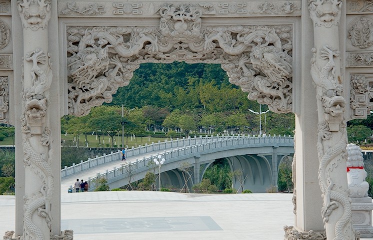 百余名惠安石雕師傅歷時(shí)兩年雕刻完工。梅山寺石質(zhì)山門總高度23米,寬23.6米,全部由花崗巖石雕刻而成,四柱三門結(jié)構(gòu),大型山門總石方用量達(dá)680多立方米,居我國(guó)現(xiàn)有石質(zhì)山門中石方用量之首。山門雕刻工藝高超,其復(fù)雜程度和難度全國(guó)罕見。斗拱采用的是整塊石材,