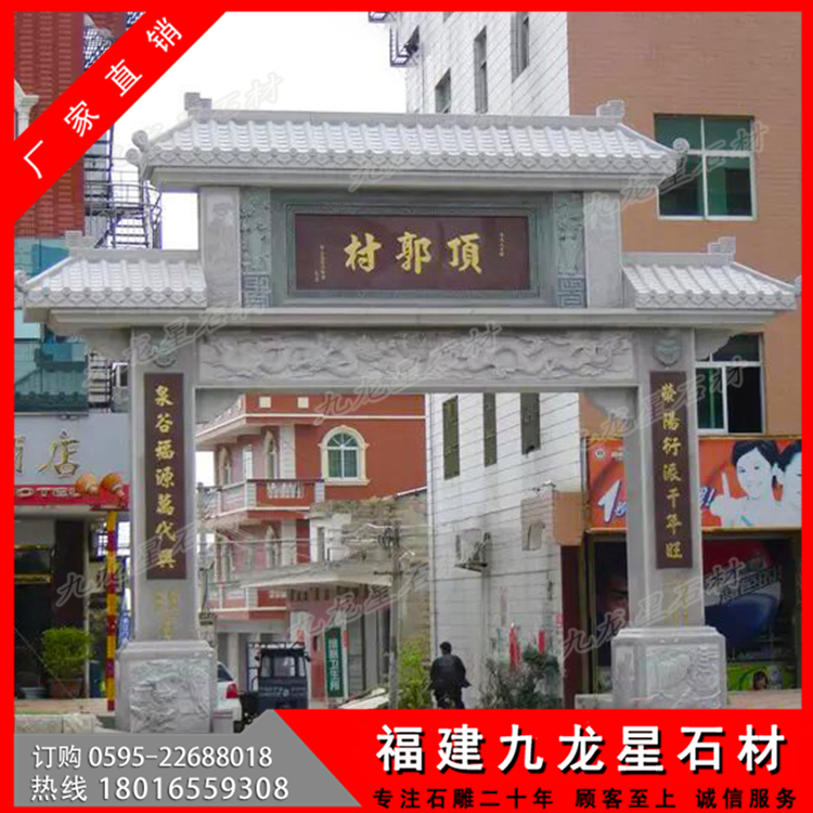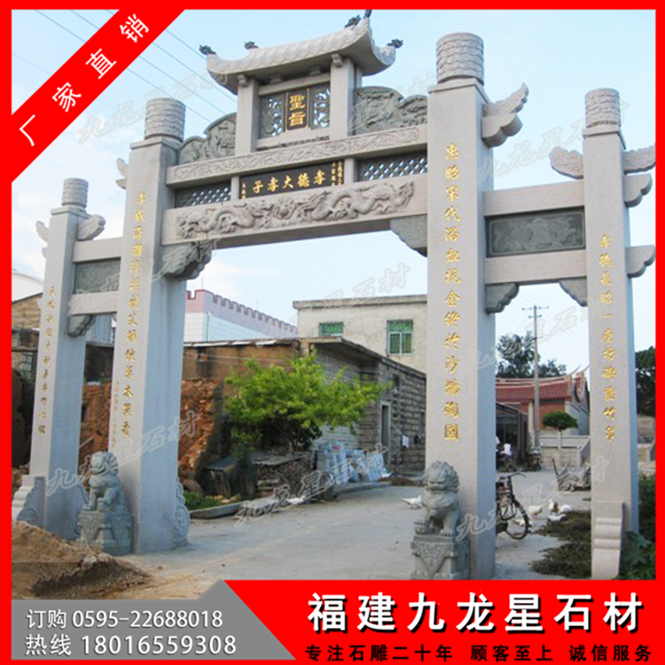 石材牌坊作為一種古色古香的建筑具有悠久的歷史,尤其是在廣大農(nóng)村地區(qū),牌坊幾乎隨處可見。特別是作為村莊入口牌坊,它可以作為一個(gè)村莊的標(biāo)志性建筑,受到廣泛的歡迎。無論是樣式復(fù)雜的牌坊還是簡單款式的牌坊,幾乎每個(gè)村子門口都會(huì)有一個(gè)這樣的建筑。