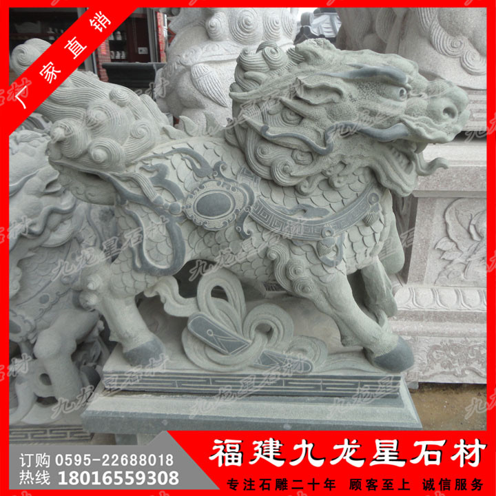 石刻麒麟是中國傳統(tǒng)工藝品之一。民間認為麒麟有鎮(zhèn)宅辟邪,增添家中吉祥的作用。石刻麒麟是古代的仁獸,集龍頭、鹿角、獅眼、虎背、熊腰、蛇鱗、馬蹄、豬尾于一身,乃吉祥之寶,從古到今都是公堂上的裝飾,以振官威之用,也是權貴的象征。 福建惠安有著極為豐富的石材資源,用**天青墨玉、霞玉、緬甸玉、漢白玉、墨玉、佘太玉、砂巖、大理石、花崗石、銀灰白石、雪花白等石材玉料雕刻石刻麒麟。